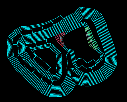 When you have finished selecting the edit layer(s), right-click to complete the operation. The operation will finish by producing polygons corresponding to the areas of Fill and Cut. Any areas where material has been added to the original topography will be coloured whatever colour you chose for Fill. (In the case of this example, they will be red.) Any areas where material has been removed from the original topography will be colour whatever colour you chose for Cut. (In the case of this example, they will be green.)