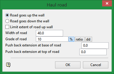 Note: Â This option requires that the pit/dump wall strings already exist. Refer to the MKRD option, or the Design Pit/Dump option, to incorporate a haul road during the pit wall projection process.