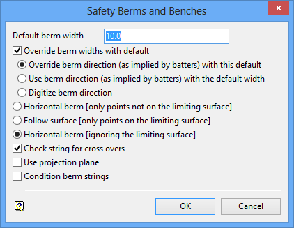You will be asked you whether or not to berm the new toe/crest string. If you select to berm, then the Safety Berms and Benches panel displays.