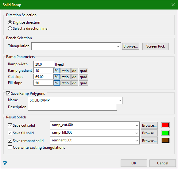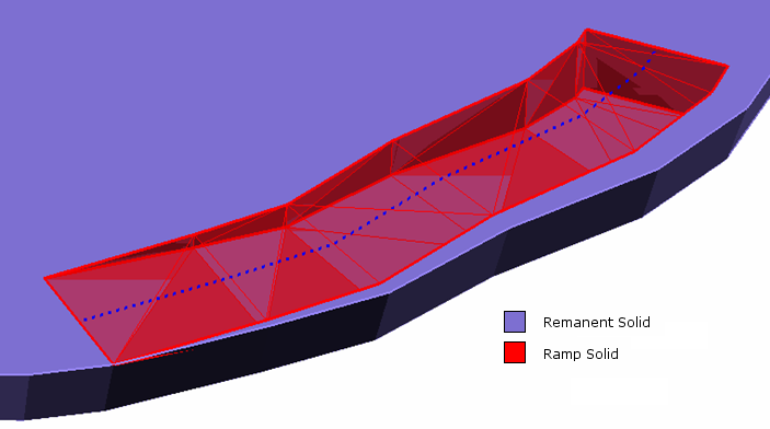 The Solid Ramps option to generate a solid ramp in a nominated bench. The Solid Ramp option will result in the creation of two triangulation files, as well as a layer that will store the ramp polygons.