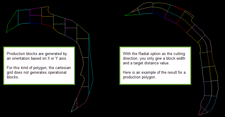 Use the Create production block polygons and blocks options, when required to create mining blocks satisfying specific target parameters. The production blocks are created by dividing the production zones, produced by the Mining Blocks Generation Setup, into smaller blocks. The production blocks are designed to satisfy a tonnage target, usually in conjunction with an existing block model, providing the block density values. Mining blocks are also created to match geometric targets like length, width, distance, area, and volume. The mining blocks also follow the mining direction and block advancement direction, specified in a subpanel of this page.