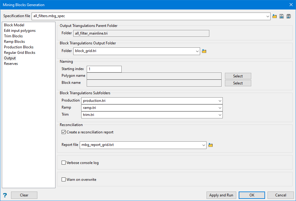 After the mining blocks are generated, the reserves can also be calculated. A reserve specification file is required. The specification files will be modified automatically and the names of all block triangulation files populated. The Advanced Reserves option is invoked and the results saved into a reserves style report file.