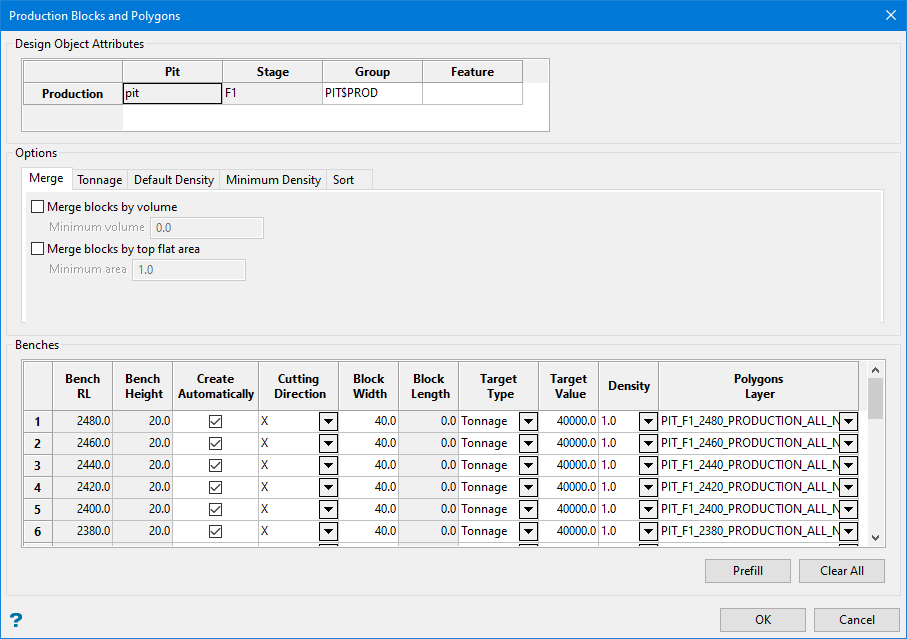A grid can be defined for each bench, but the whole Benches table can be also prefilled using the Prefill button.