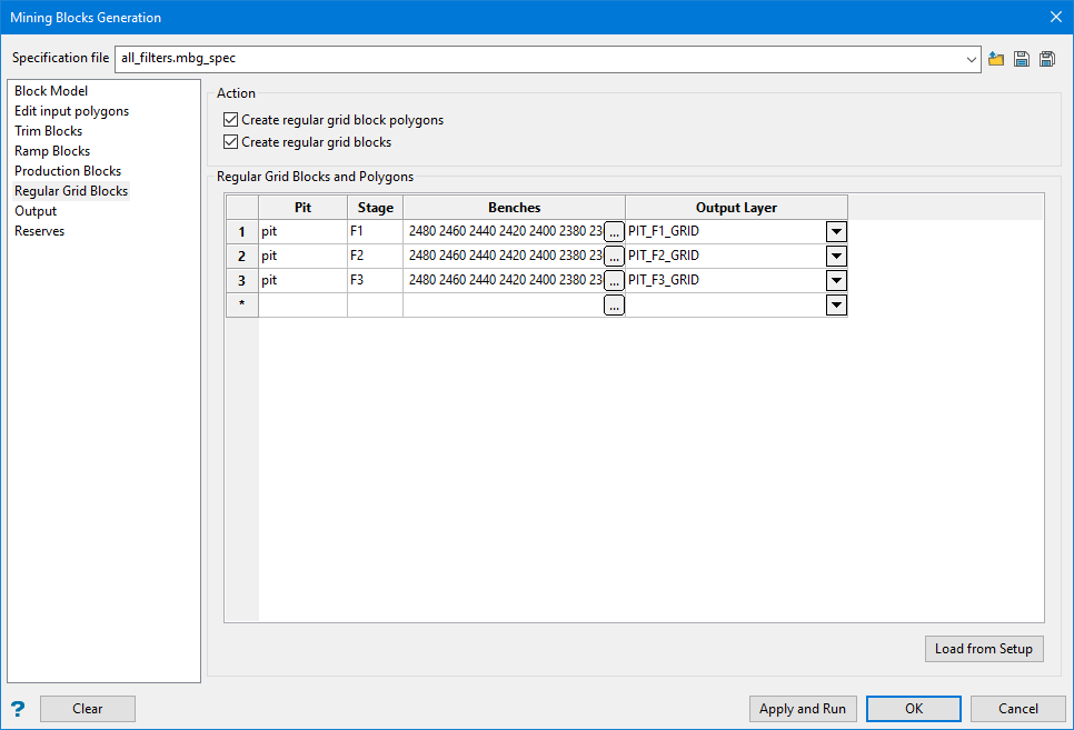The regular grid blocks are cut out from the benches using vertical planes, positioned at the target mining blocks dimensions. The regular grid polygons can optionally be created as well. The blocks and the polygons are created inside each bench production zone polygon, generated by the MBG Setup. In the absence of production zone polygons, and on user request, the mining blocks and polygons may be created using the full bench outline in place of the production zone. The polygons are saved in the design database, and the blocks are saved as triangulations, under the file hierarchy specified during setup.