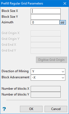 Tip: Â The Digitise button collapses the panel. Then you will be prompted to pick a point on the screen for the grid origin at the lower left corner of the grid extent, followed by a point at the upper right corner of the grid extent. A confirmation popup will be displayed asking if you accept or want to retry digitising the origin. On Accept, the subpanel is redisplayed, all coordinates are filled in the grid extent columns automatically, and the last three read-only columns Number of Blocks X, Number of Blocks Y and Estimated Block Volume are updated, providing feedback for approximate outcomes at the specified grid parameters.