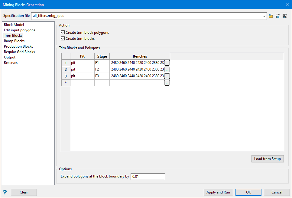 First, trim polygons with parameters matching the required target are created for each bench trim zone. Then the trim blocks are cut out from the benches using the polygons. The polygons are saved in the design database, and the blocks are saved as triangulations, under the file hierarchy specified during setup.