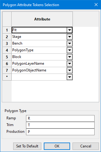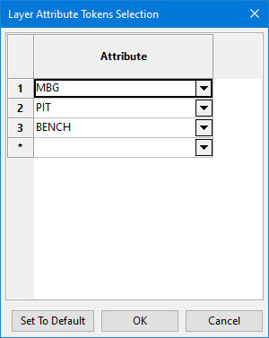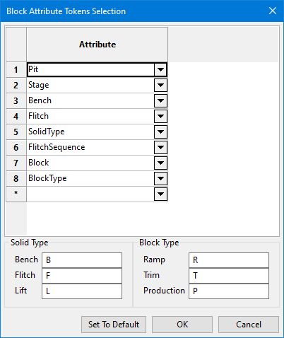 The trim polygons and blocks naming is flexible, including an optional staring index, the name of the pit, stage, bench, the block type, block identifier, and any prefix, suffix or text that the user enters at the Attributes Tokens subpanel, which opens on clicking the Select button.