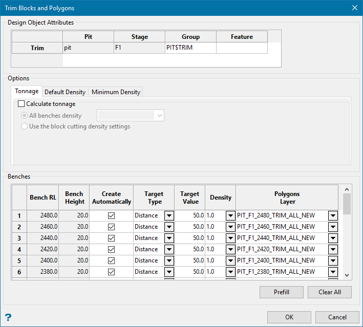 The Mining Blocks Generation can create trim polygons automatically, use existing polygons that you have already created, or not create them at all. When the checkbox in the Create Automatically column is selected, the Mining Blocks Generation will create the polygons automatically matching the specified Cutting Direction, Target Type and Target Value. If the target type is tonnage, then a Density value must entered.