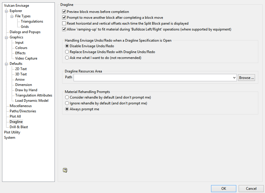Note: Â If a resources area is specified, then Vulcan will only list files found in the nominated Dragline resources area when using the Dragline Equipment and Ancillary Equipment options. If you are using these options and want to select a file from a different location, that is, a directory other than your Dragline resources area, then you will need to turn off this preference before using the applicable option.
