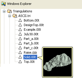 In the case of triangulation and grid files, preview images are only shown after the Compress option has been selected in a Vulcan session that uses the thumbnail preference. Once the compress process has been completed, you will need to load, edit and remove the file from the screen in order to correctly display the preview image. Refer to the Vulcan Explorer context menu section for more information on the Compress option.