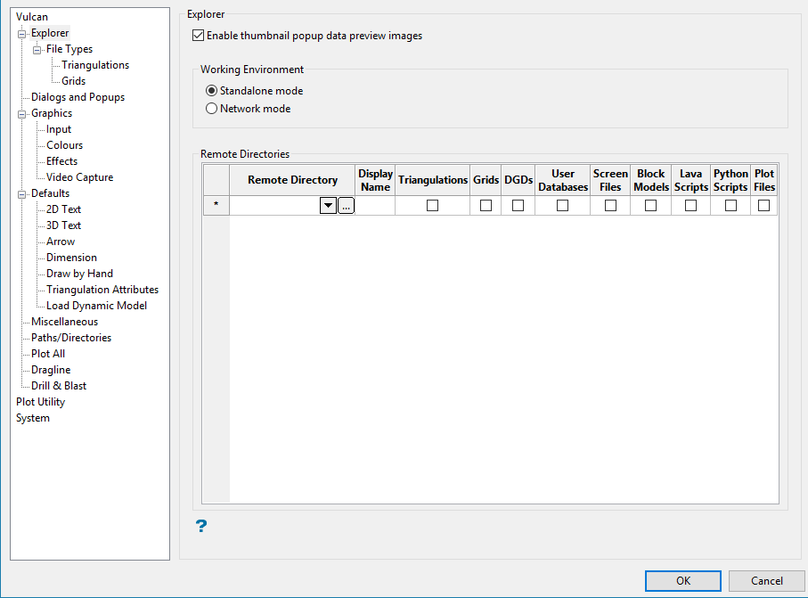 Use Vulcan Explorer preferences to choose to show layer descriptions in the Vulcan Explorer by default, and to specify directories other than your working directory to appear in the Vulcan Explorer. You specify the virtual folders, for example: Triangulations, Grids, etc., in which the remote directory should appear. In this way, you can take advantage of the Vulcan Explorer context menu and the "drag and drop" facilities with files not stored in your current working directory.