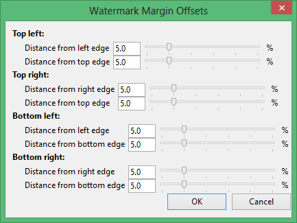 To define a series of offsets (padding) for the image, click Offsets to display the Watermark Margin Offsets panel. Using a percentage number, these settings allow you to move the watermark image closer or further away from the top, bottom, left, and right edges of the plot.