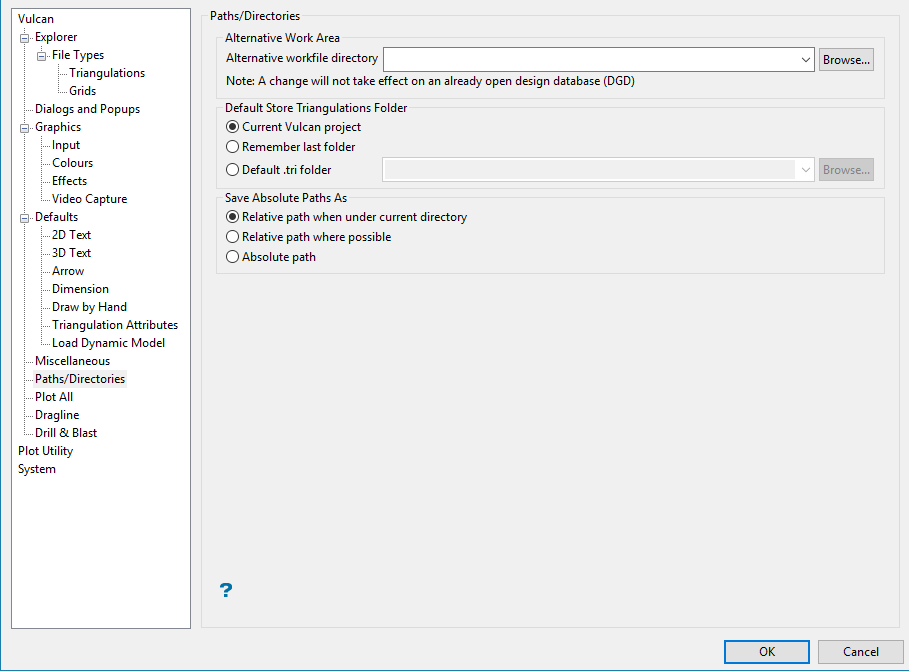 This section of the interface allows you to specify the default storage directory for all triangulations created in the current Vulcan session. You have the choice of either storing the triangulations in your current working directory, the last folder used or in a nominated folder or subdirectory.