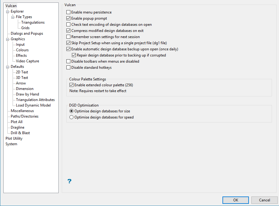 Select this check box to bypass the VULCAN 3D Software Project Setup Wizard whenever you start a Vulcan session with a dataset that only contains a single project file (.dg1).
