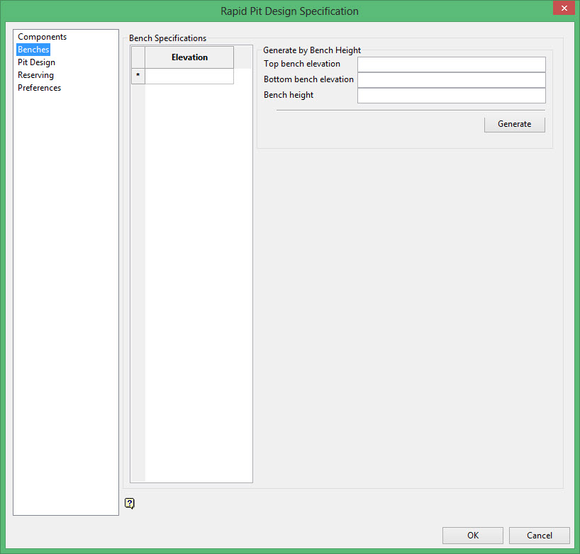 Enter in the bench elevations starting with the lowest bench and going to the highest bench. Elevations should be defined at the mid-bench level.