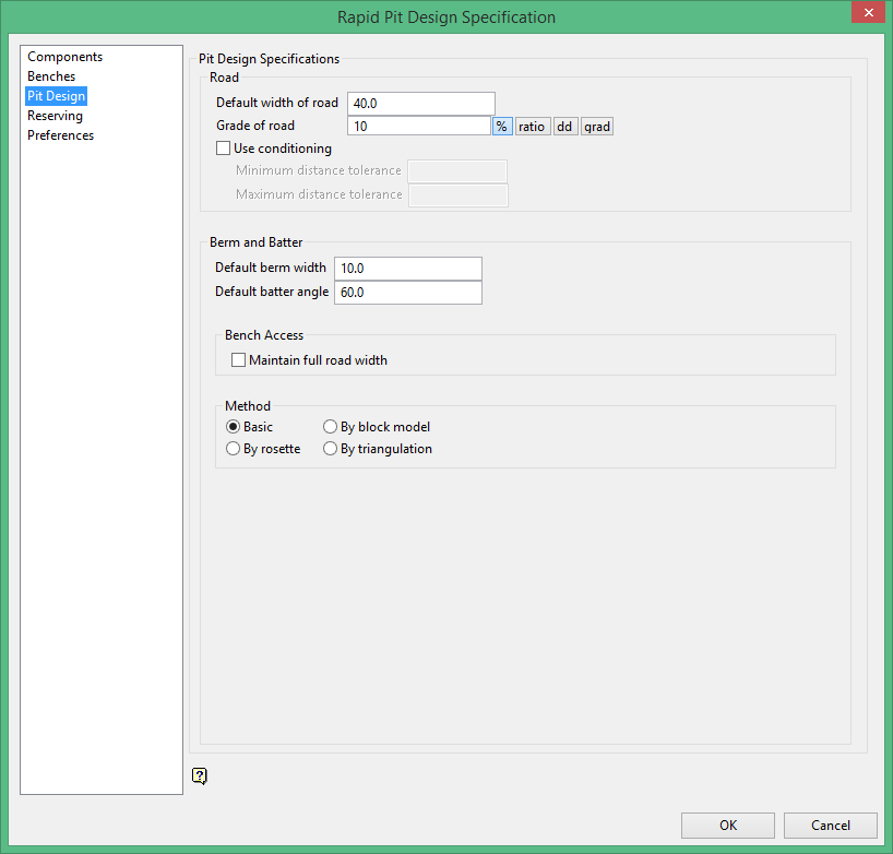 Enter the default berm width to be used. This will be used in the calculation to determine the overall slope angle based on batter, berm, and bench projection.