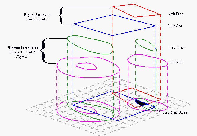 In the Horizon Parameters, polygons in a layer are unioned(or' ed). Multiple layers are intersected(and' Ed). In Report Reserves, polygons in a limit layer are intersected, i.e. each polygon acts as a new limit.