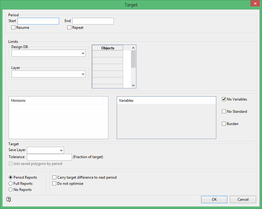 Use the Target option to report reserves for each targeted period. This option requires a grid, a sequenced series of mining polygons and target periods.