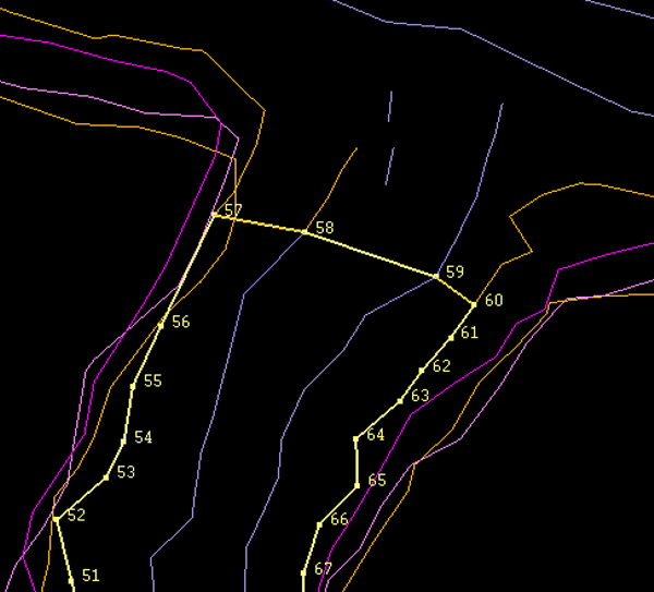 - Use Design > Point Edit > Append to append a line which connects end points up to but not including the last string in this pillar line group. The appended line for the pillar object exactly matches the line previously appended to the main drive object. Similarly, use Design > Object Edit > Join Lines to close the boundary of this object, exactly matching the boundary to the main drive object. In the example shown below, the end points of the pillar object were connected by appending a line from point 57 to 59, and then joining points 59 and 60.