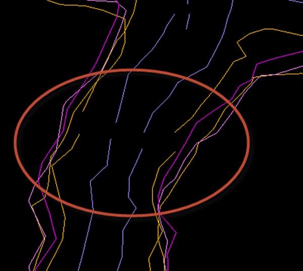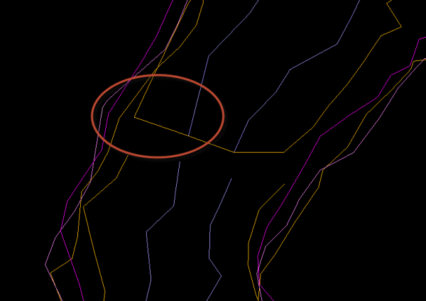 - Identify an area where the lines in this group run close to each other and then at this point split each line in this group. To split a line, click Design > Object Edit > Split:Split by Point and follow the on-screen instructions. The example below shows all Back strings split.
