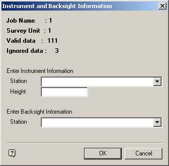 Note: Â At each survey unit, the first foresight station data is read as backsight azimuths. Therefore, if the job has no foresight points in the file, you will need to enter the backsight azimuth (in the appropriate angular unit).