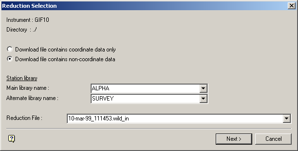 Enter, or select from the drop-down list, the name of the download file that you want to reduce. The drop-down list contains all of the download files that are applicable to Survey_the.gif10 instrument, that is, download files with the extension .wild_in or.gsi (if the instrument uses PC cards for storage).