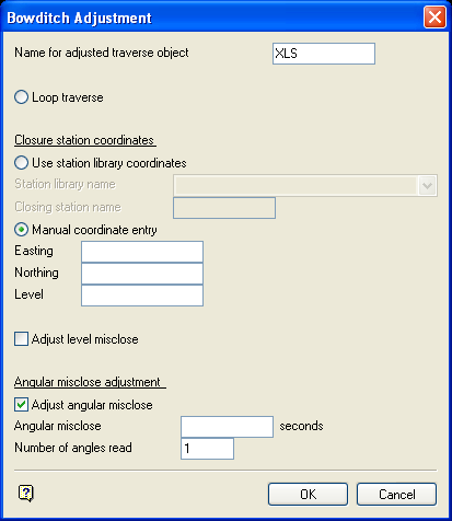 Select this check box to correct any angular misclose that may have been measured. Enter the Angular misclose in seconds. The Number of angles read is by default the number of legs in the traverse. This should be altered to reflect the number of angles actually read in the traverse. The angular misclose adjustment is done in the standard way, dividing the misclose by the number of angles read and distributing this proportionally to each traverse leg.