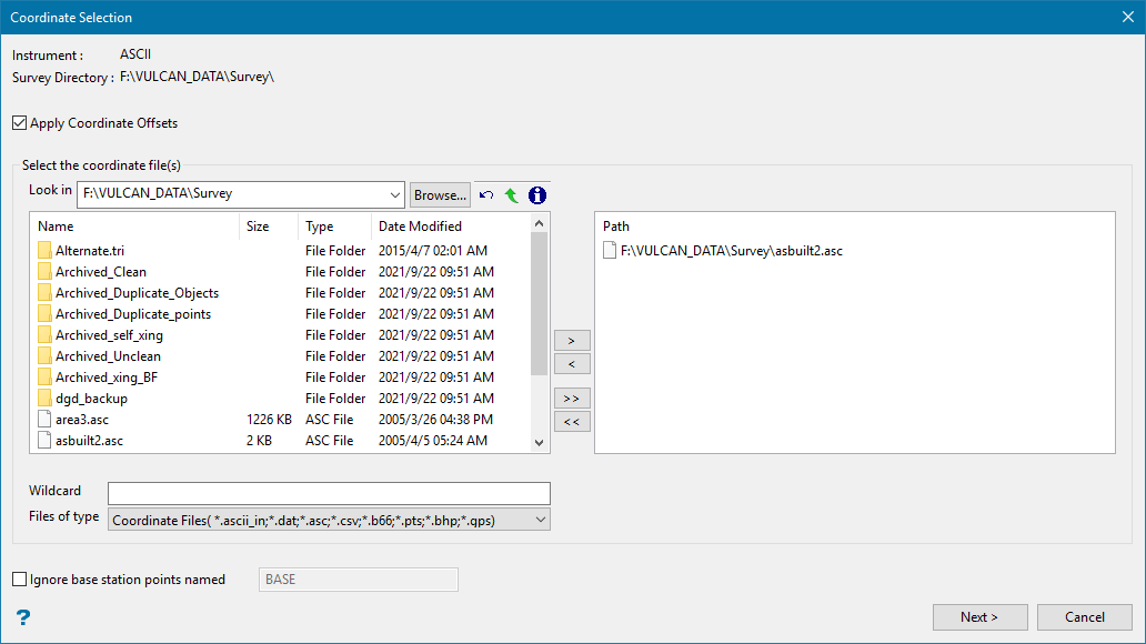 Select this check box to ignore a named point when importing survey coordinate data. Wildcards (* multi character wildcard and % single character wildcard) can be used. Any point that matches the specified name will be ignored when forming the Vulcan objects.
