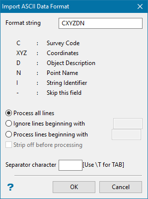 Objects are broken by a change in survey code or string identifier. You can process the entire file (Process all lines); or only process the lines that begin with (Process lines beginning with) or don't begin with certain characters (Ignore lines beginning with).