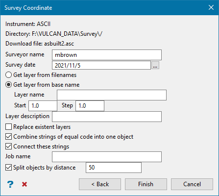 Select this check box to combine strings of equal code into one object. If this check box is checked, then all the points in the same job with the same feature code are placed into one object. If this box is not checked, then Vulcan objects will be formed based on strings of consecutive points with the same feature code.