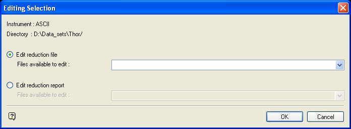 Select this option to edit a specific reduction report. Enter, or select from the drop-down list, the name of the reduction report that you want to edit. You should note that this is a viewing mechanism for the reduction reports, therefore editing of these files will have no effect on the reduced data.