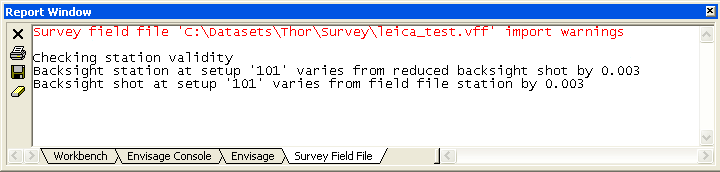 Results from the stations validity check will also be displayed in the Survey Field File tab of the Report Window.