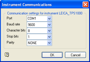 This panel to view and/or adjust the communication settings, that is, port number, baud rate, character bits, stop bits and parity, for the chosen survey instrument. Changes will be saved to the perif.setup file.