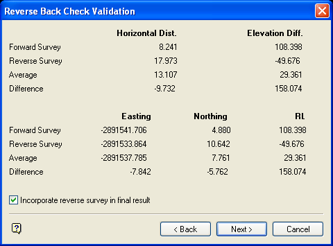This panel shows the results of the reverse back check. That is, the horizontal distance, elevation difference, Easting, Northing and RL of the forward and reverse survey, as well as the average and the difference of all of these values. Check the Incorporate reverse survey in final result check box to incorporate the reverse survey in the final report.