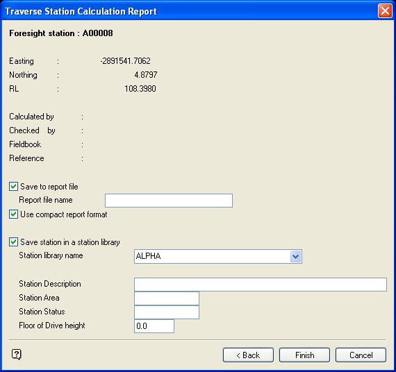The station name, together with its location, are displayed at the top of the panel. The Calculated by, Checked by, Fieldbook and Reference fields are carried forward from the Traverse Station Calculation panel. These details are for information purposes only and cannot be changed on this panel.