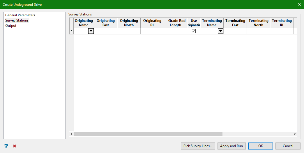 Note: Â When users choose to use bearing and gradient from the originating station rather than coordinates of the terminating station for the direction of the survey line, the Use Orig. and Term. Name columns are disabled. This is because the direction of the survey line is given as the direction from the originating station.