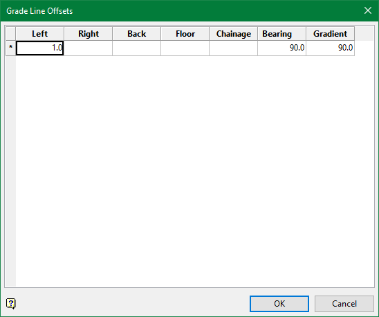Clicking on the grid displays the Grade Line Offsets panel. This panel allows to enter a set of seven values along with the option to pick survey lines. Each set defines a single drive cross-section and consists of a Left, Right, Back, Floor, Chainage, Bearing, and Gradient value.