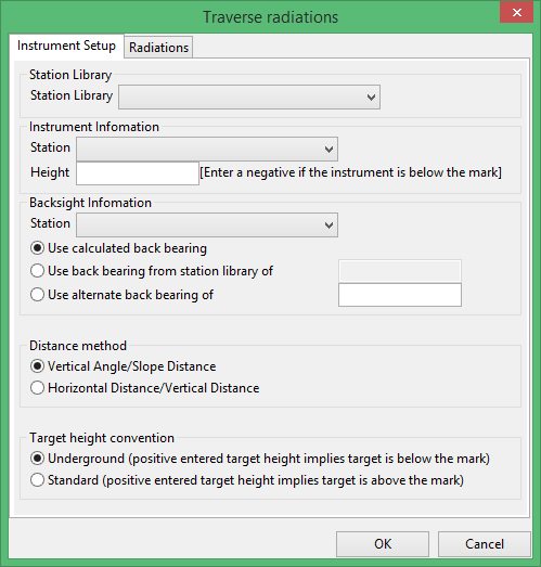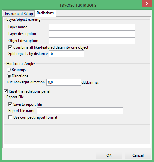 The Radiations option to calculate set out radiations from a nominated station (selected either graphically or by name from a list) to a selected object. The calculations can be stored in a report file. See Appendix A for an example.