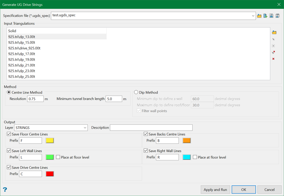 This method uses the list of triangulations during the process and extracts a line in the geometric centre of the drive i.e. tunnel. This line is then projected to the roof, floor, and walls of the tunnel. However, the wall lines may be lowered to the floor level of the drive.