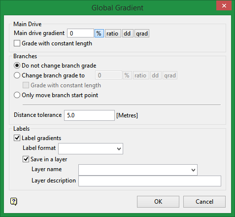 Enter the desired gradient value for the main drive. The gradient value can be entered as a percentage, ratio, decimal degrees or gradians.
