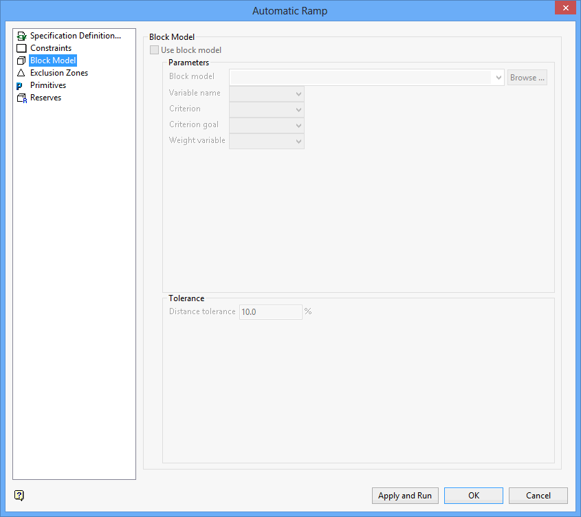Use Block Model to specify a goal based on a block model variable, for example minimum cost, maximum grade, maximum metal, etc. For more information, see the Automatic Ramp Overview.