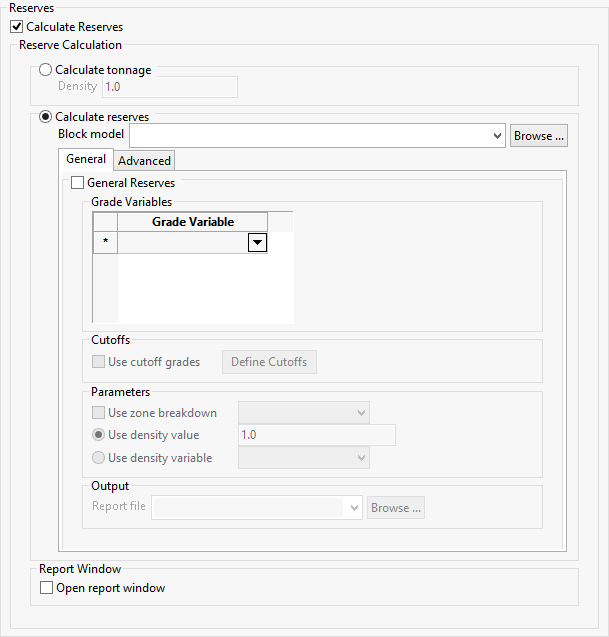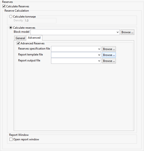 Select this check box to calculate advanced reserves. You will need to nominate an existing reserves specification file (.res), an existing report specification file (.tab) and the name of the resulting report file (.rep). The appropriate files can either be s elected from the available drop-down lists or through using the Browse buttons.