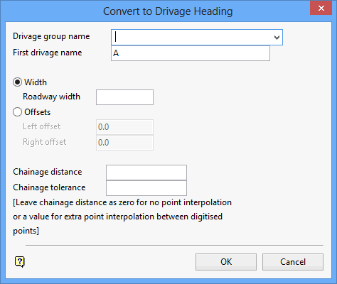 Select this option if you want to create drivage headings as centre lines of the roadway. If this option is selected, then you will need to specify the width of the roadway.