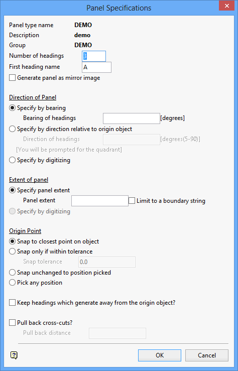 The panel extent can be defined as an absolute value or by digitising (the latter only if the direction of the panel will also be digitised). Specifying an absolute value as the panel extent also to limit the panel generation to a boundary, for example a fault line, another roadway, site limit boundary etc. See Diagram 1.