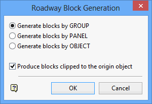 Y ou will then be prompted to select an object. Once selected, all objects in the specified category (group, panel or object) will be highlighted. In the case of selecting by object, and that object happens to be a heading survey line, then all cross-cuts that start from that heading will also be highlighted. Each selection needs to be confirmed. Upon confirmation, the roadway blocks are generated.