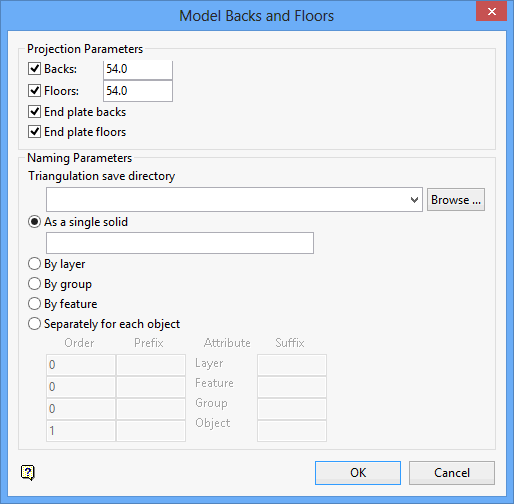 The triangulations can be named with various combinations of layer, feature and group. The order determines if the attribute is going to be incorporated into the name or ignored. Orders of less than or equal to zero are ignored, where as a value greater than one will be included.