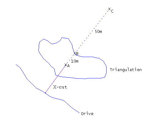 -50m, X-cut extends to 50m beyond far side (C) -