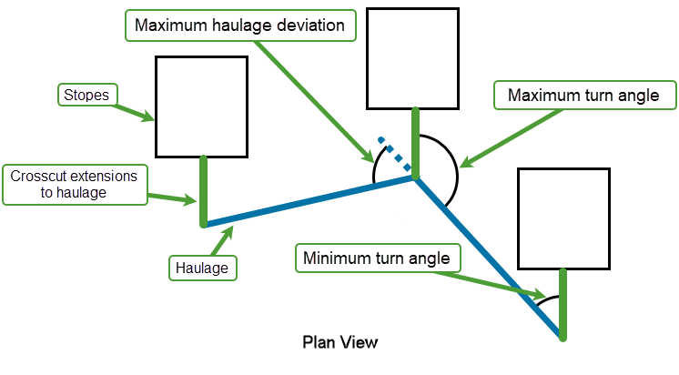 Enter the maximum angle for turning in from a haulage to a crosscut in the Maximum turn angle field in either decimal degrees (dd) or radians (rad).