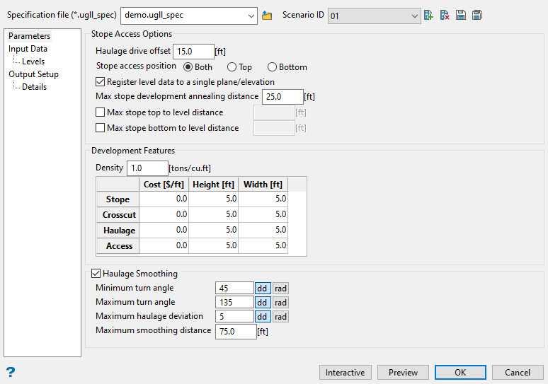 To quickly see a preview of the initial underground development generated with this option, you need only to populate the Specification file (*.ugll_spec) and Scenario ID fields, in addition to selecting stope triangulations of interest in the Input Data pane before clicking Preview at the bottom of the interface. All other panel options can be left as defaults for the preview and refined as needed.