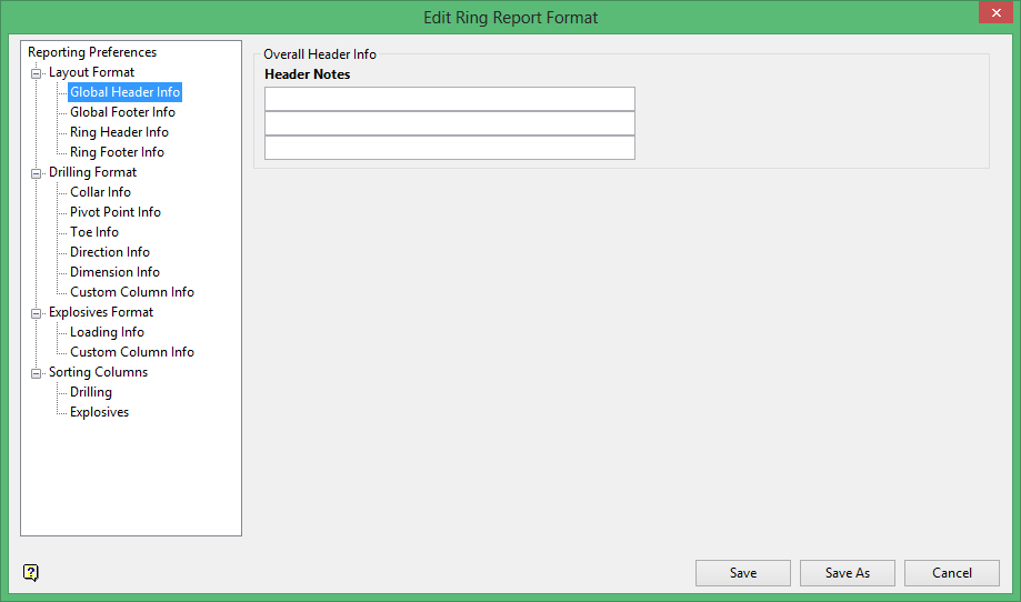 Use Layout Format to configure the contents of the headers and footers for the report as a whole, and for the ring section of the report.